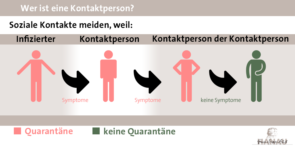 Wer Kontakt zu einer Person in der Familie, im Freundes- oder Bekanntenkreis hatte, die wiederum Kontakt zu einem im Labor bestätigten COVID-19-Patienten hatte, aber völlig gesund ist, muss nicht in Quarantäne. In diesem Fall ist man keine Kontaktperson, hat kein erhöhtes Risiko für eine COVID-19-Erkrankung und kann auch niemanden anstecken. Im Fall von Krankheitszeichen einer Atemwegserkrankung sollte man sich jedoch testen lassen.