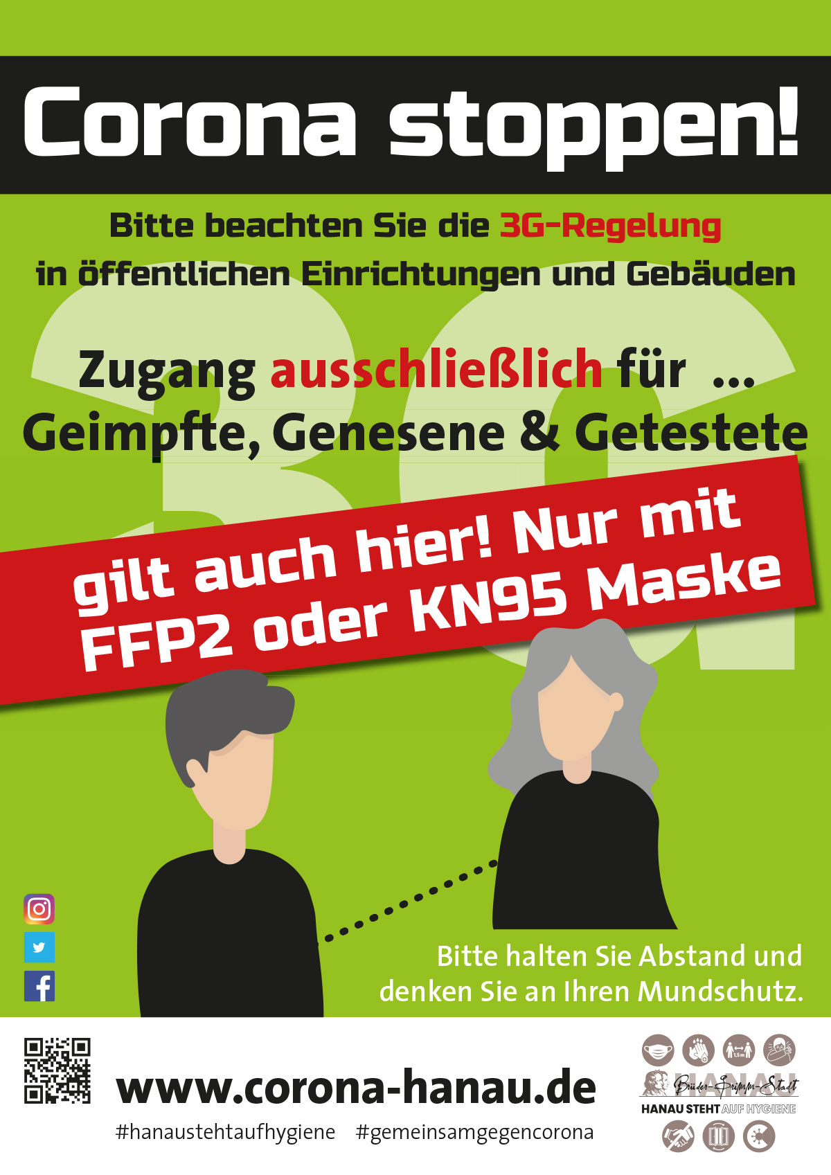 Aus Sorge über weiterhin steigende Infektionszahlen insbesondere in Zusammenhang mit der neuen Omikron-Variante des Corona-Virus werden die Zugangsregelungen für die Räumlichkeiten des Hanauer Rathauses und anderer städtischer Einrichtungen weiter verschärft. Ab sofort müssen Besucherinnen und Besucher eine FFP2-Maske oder KN95-Maske tragen. Sogenannte OP-Masken reichen nicht mehr aus, um die Maskenpflicht zu erfüllen. Kinder im Alter bis 6 Jahre sind davon ausgenommen.